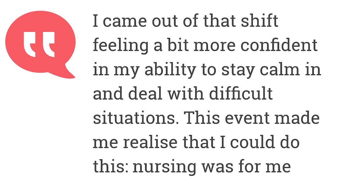 This event made me realise that I could do this: nursing was for me and I would work hard to gain more experience, confidence, and to progress in the profession.