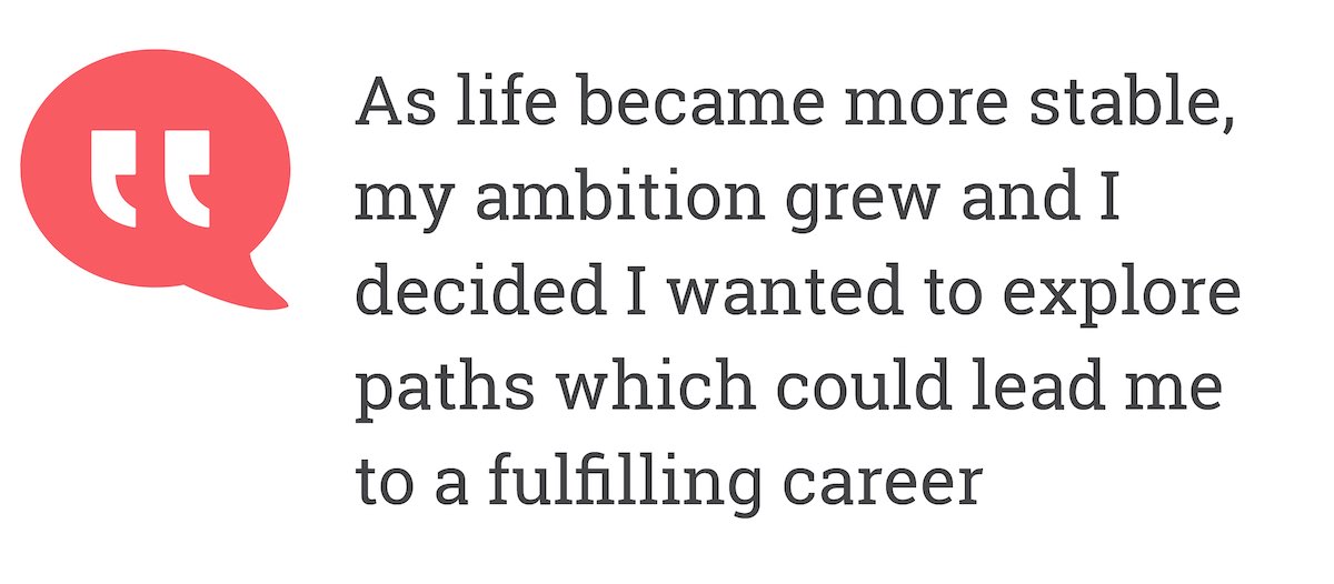 As life became more stable, my ambition grew and I decided I wanted to explore paths which could lead me to a fulfilling career.