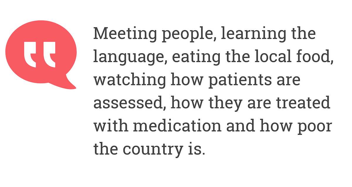 Meeting people, learning the language, eating the local food, watching how patients are assessed, how they are treated with medication and how poor the country is.