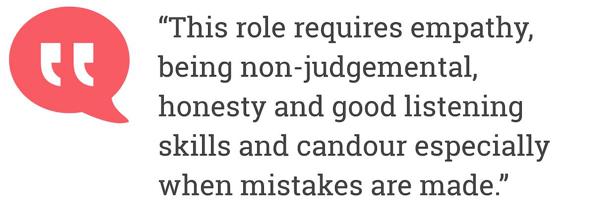This role requires empathy, being non-judgemental, honesty and good listening skills and candour especially when mistakes are made.