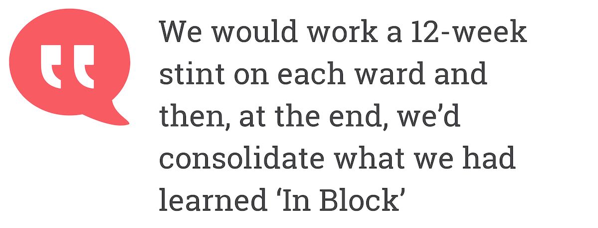 But I relished my time there. We would work a 12-week stint on each ward and then, at the end, we’d consolidate what we had learned ‘In Block’ (as it was called).