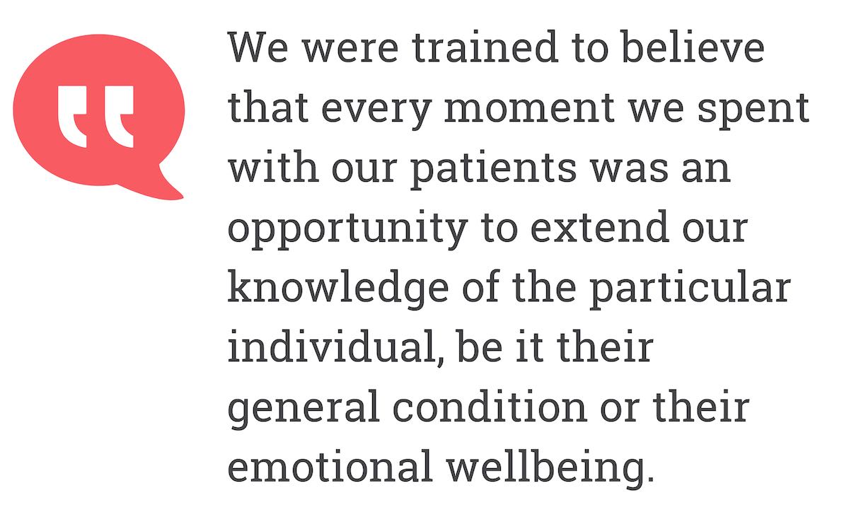 We were trained to believe that every moment we spent with our patients was an opportunity to extend our knowledge of the particular individual, be it their general condition or their emotional well-being.