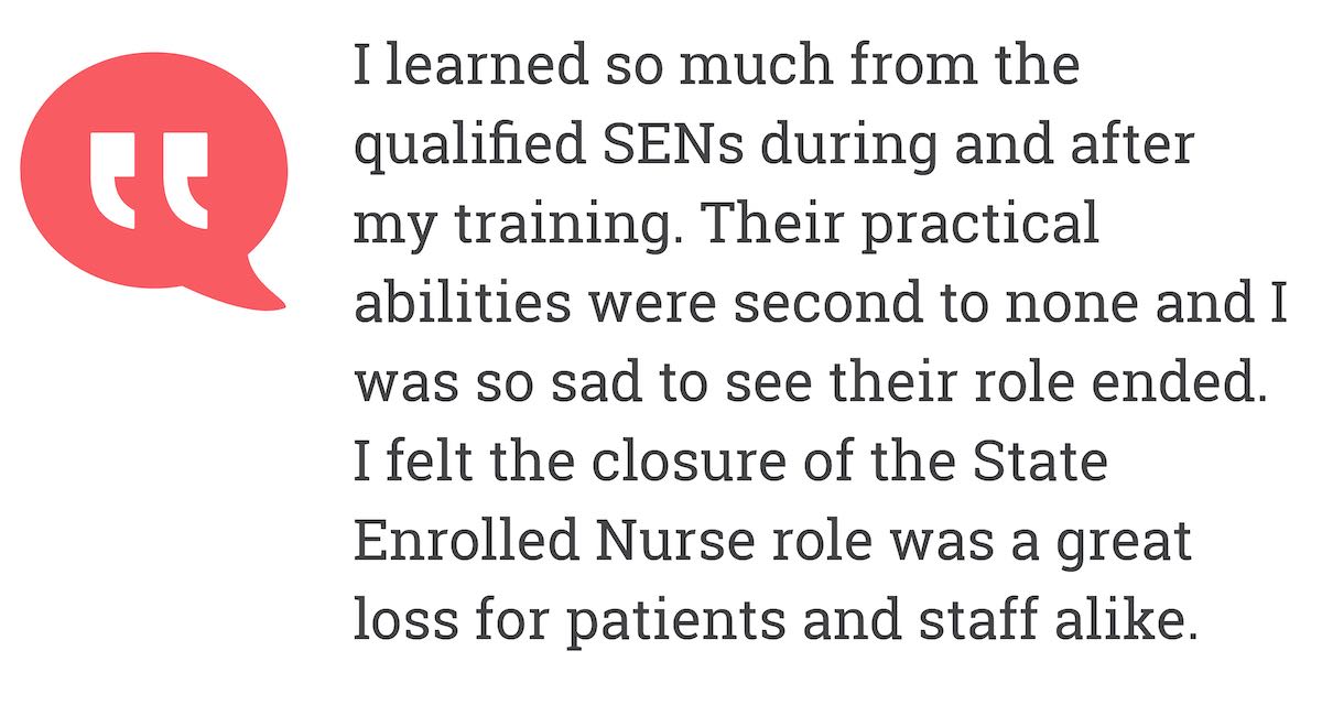 I learned so much from the qualified SENs during and after my training. Their practical abilities were second to none and I was so sad to see their role ended. I felt the closure of the State Enrolled Nurse role was a great loss for patients and staff alike.