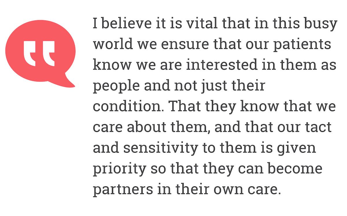 I believe it is vital that in this busy world we ensure that our patients know we are interested in them as people and not just their condition.