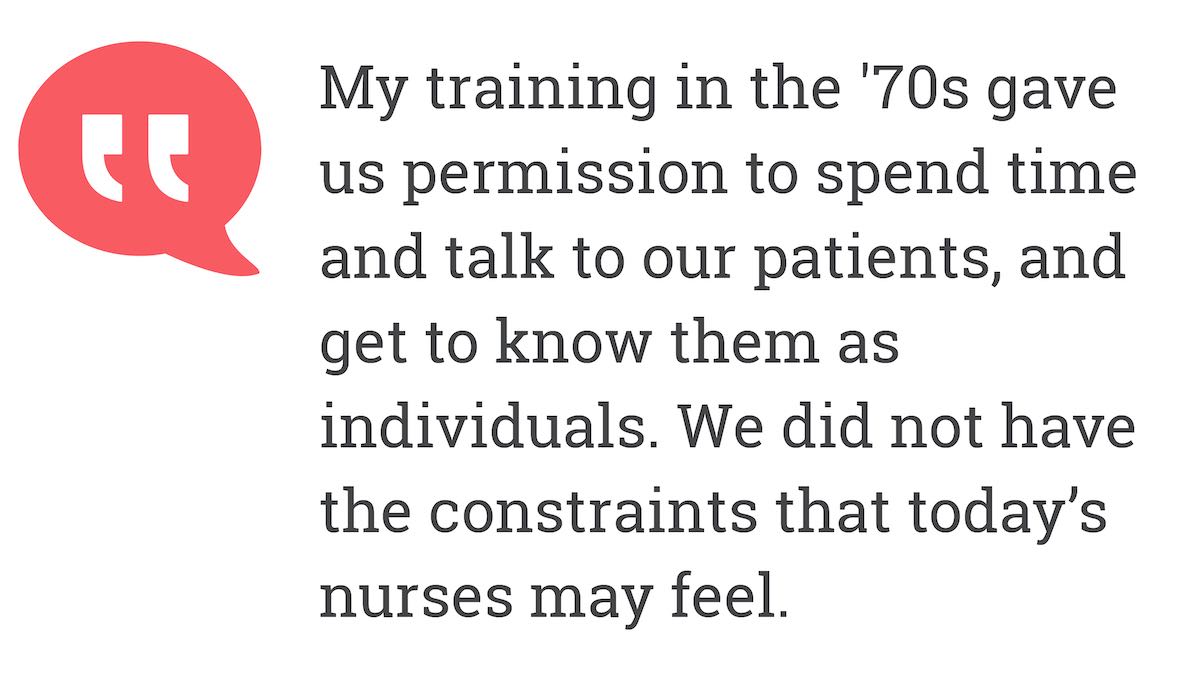 My training in the 1970s gave us permission to spend time and talk to our patients, we weren’t made to feel guilty for getting to know them as individuals and did not have the constraints that today’s nurses may feel.