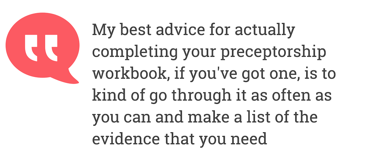 My best advice for actually completing your preceptorship workbook, if you've got one, is to kind of go through it as often as you can and make a list of the evidence that you need, because mine definitely was so much more time-consuming because I didn't realise that I needed the evidence for something until after I'd done it, and then I was having to go back and hunt through it, whereas if you've already got in your mind sort of five or six things that you need at any one time, when you do it you just automatically print it out and put it in your folder and then kind of look for another thing that you can start having in your mind.