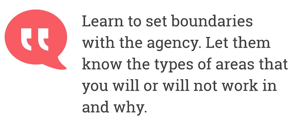 Also, learn to set boundaries with the agency. Let them know the types of areas that you will or will not work in and why.