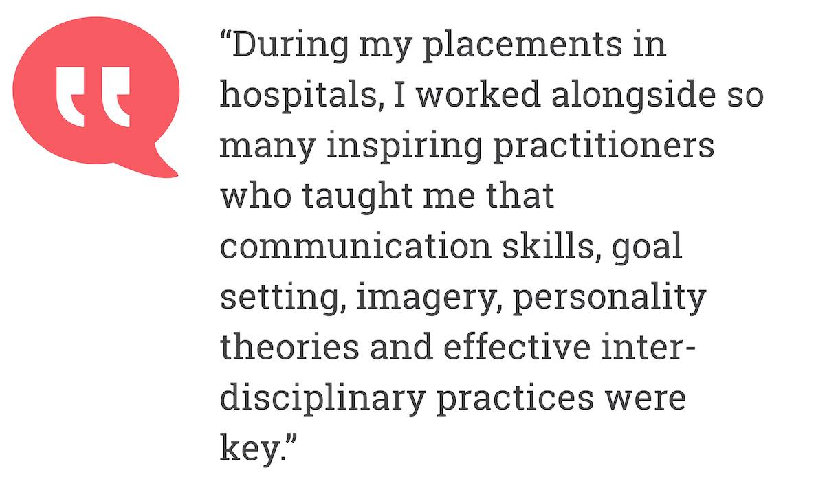 During my placements in hospitals, I worked alongside so many inspiring practitioners who taught me that communication skills, goal setting, imagery, personality theories and effective inter-disciplinary practices were key.