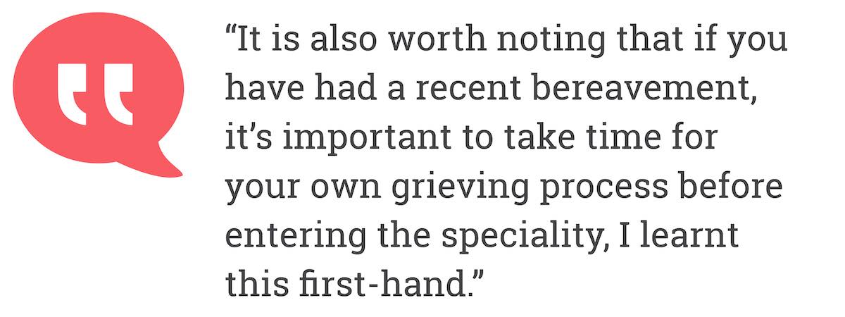 It is also worth noting that if you have had a recent bereavement, it’s important to take time for your own grieving process before entering the speciality, I learnt this first-hand.