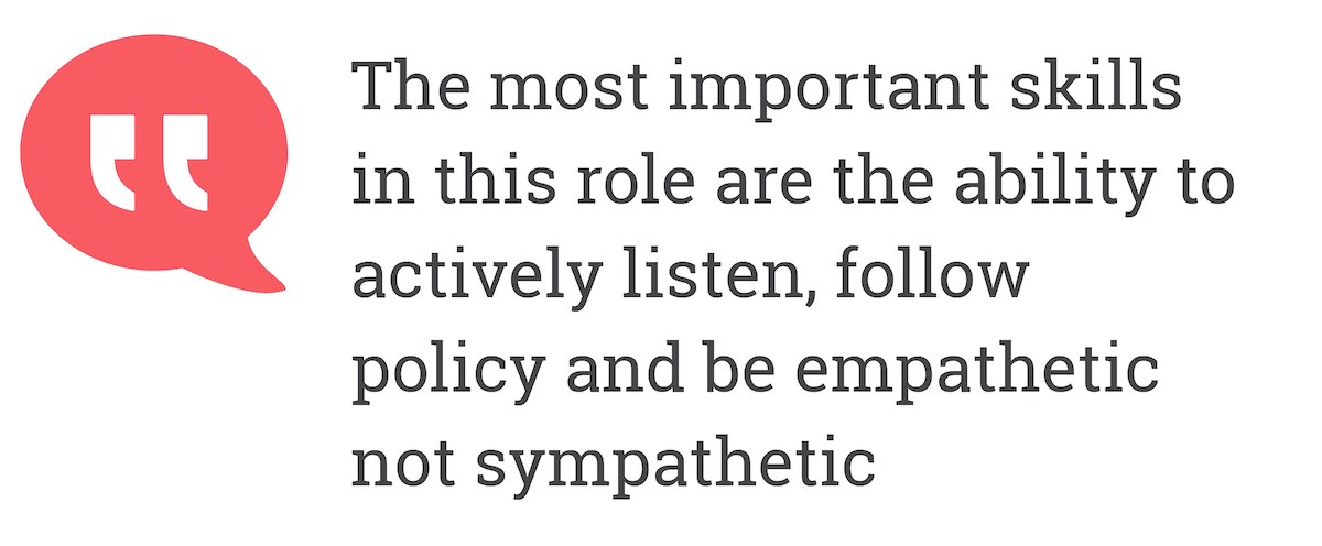 The most important skills in this role, in my opinion, are the ability to actively listen, follow policy and be empathetic not sympathetic.