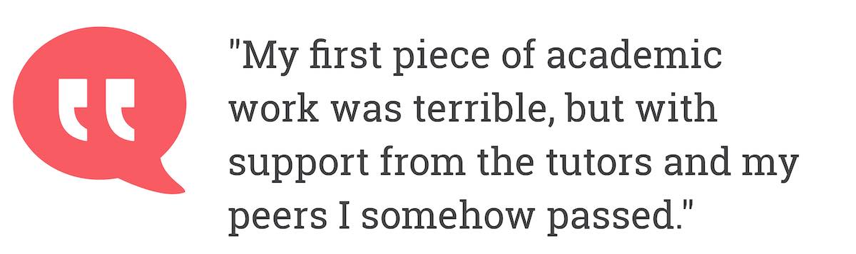 My first piece of academic work was terrible, but with support from the tutors and my peers I somehow passed.