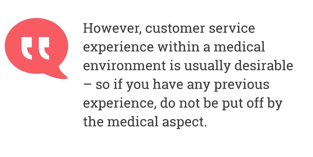 However, customer service experience within a medical environment is usually desirable – so if you have any previous experience, do not be put off by the medical aspect.