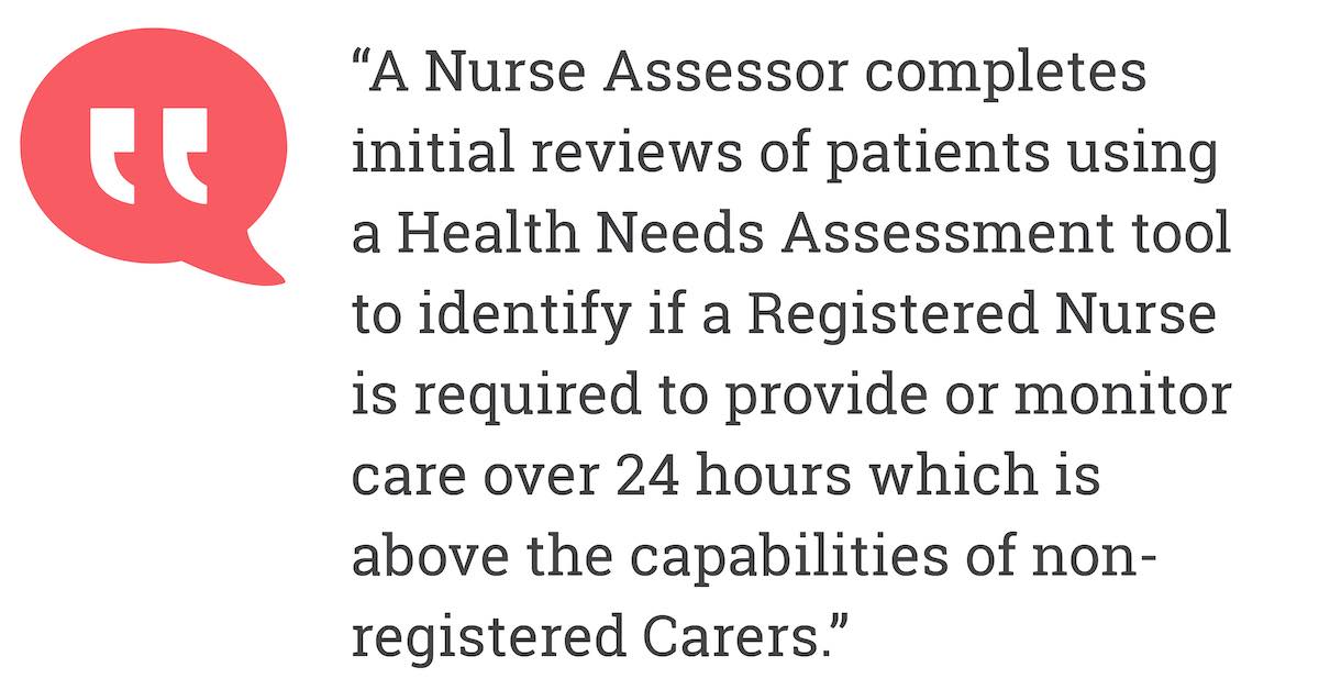 A Nurse Assessor completes initial reviews of patients using a Health Needs Assessment tool to identify if a Registered Nurse is required to provide or monitor care over 24 hours which is above the capabilities of non- registered Carers.