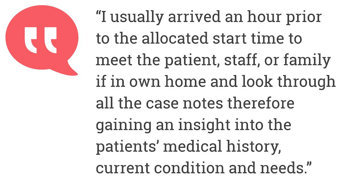 I usually arrived an hour prior to the allocated start time to meet the patient, staff, or family if in own home and look through all the case notes therefore gaining an insight into the patients’ medical history, current condition and needs.
