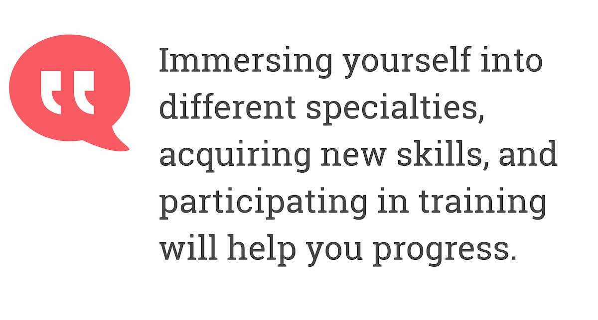 Immersing yourself into different specialties, acquiring new skills, and participating in training will help you progress.