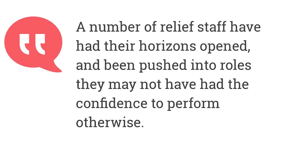 A number of relief staff have had their horizons opened, and been pushed into roles they may not have had the confidence to perform otherwise.