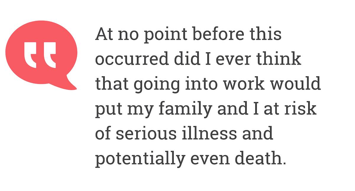 At no point before this occurred did I ever think that going into work would put my family and I at risk of serious illness and potentially even death.
