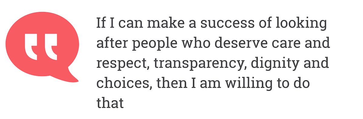 And if I can give you the tools that you need to be able to make a success of looking after people who deserve care and respect, transparency, dignity and choices, then I am willing to do that.