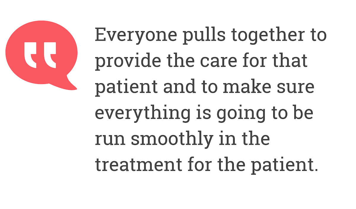Everyone pulls together to provide the care for that patient and to make sure everything is going to be run smoothly in the treatment for the patient.