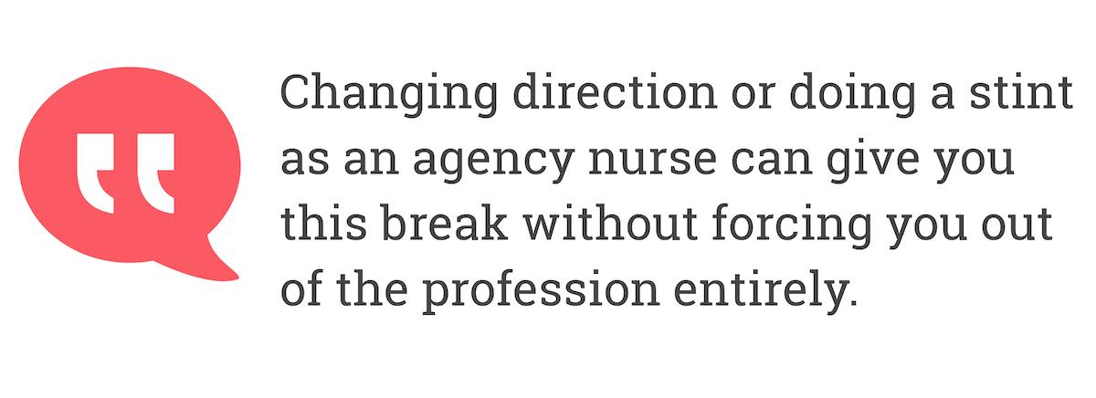 In such an emotionally and physically demanding job, it's good to have a change and burn out is common. Changing direction or doing a stint as an agency nurse can give you this break without forcing you out of the profession entirely.
