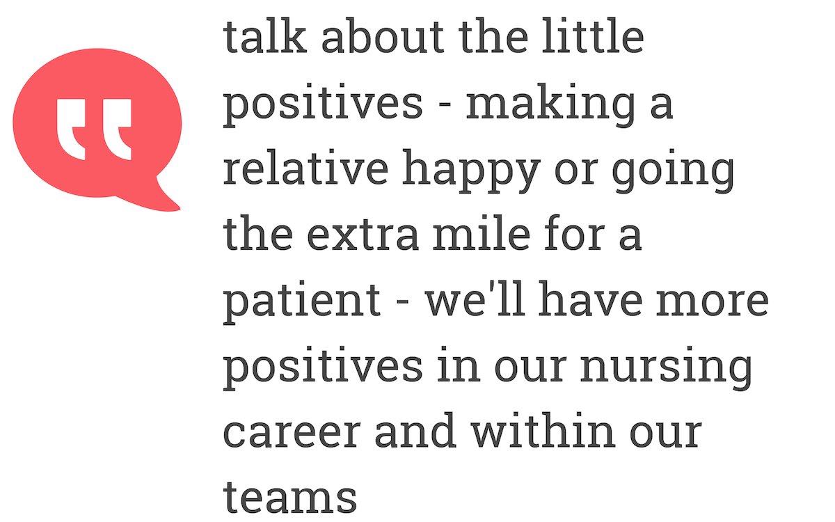 So focusing on your strengths such as maybe you had a really good connection with someone today, maybe you've really helped a relative feel more comfortable. Maybe you helped a staff member out who was struggling or having a difficult day. And it's by focusing on the positives in this difficult sometimes job, then we will take more positives out and it will become less negative and more about the little wins. So we're not talking huge big positives like everyone's happy all the time because that's not necessarily true. But if we talk about the little positive such as like what I was saying about making a relative happy or going a little extra mile for a patient. And if we focus on that, then hopefully we'll have more positives in our nursing career and within our teams, on colleagues and all of those connections that we've made.