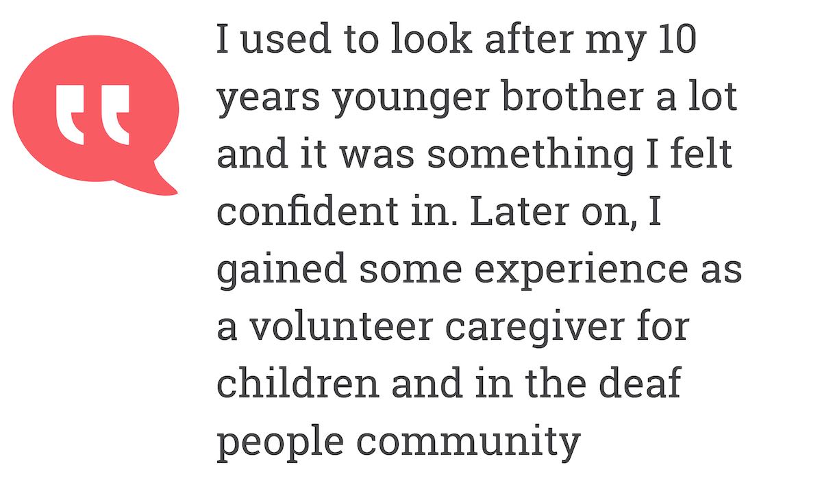Later on, I gained some experience as a volunteer caregiver for children and in the deaf people community.