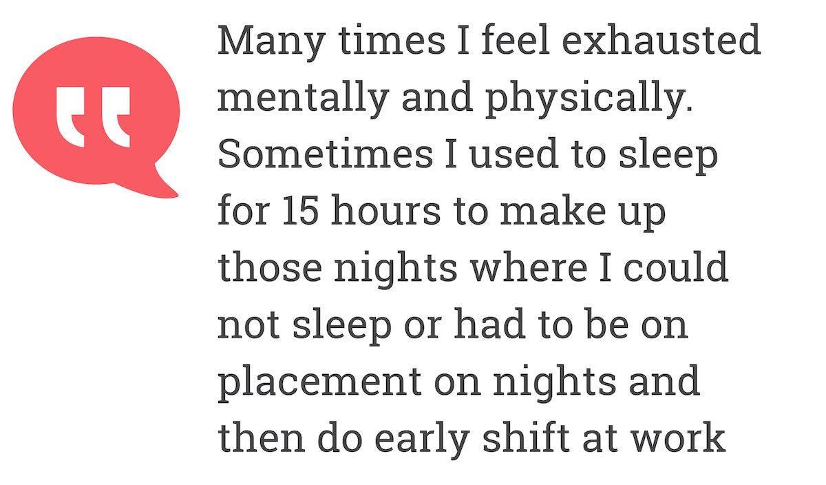 Sometimes I used to sleep for 15 hours to make up those nights where I could not sleep or had to be on placement on nights and then do early shift at work.