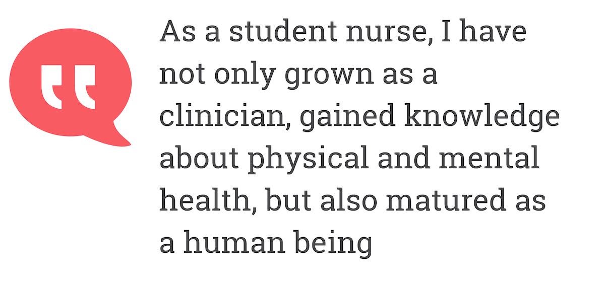 "As a student nurse, I have not only grown as a clinician, gained knowledge about physical and mental health, but also matured as a human being"