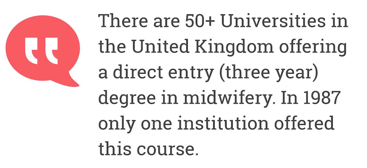 Fast forward to 2021 and there are more than 50 major Universities in the United Kingdom offering a direct entry (three year) degree in midwifery compared to early 1987 when only one institution offered this course to people who were not nurses.
