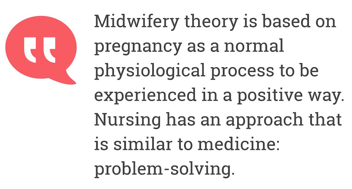 "Midwifery theory is based on pregnancy as a normal physiological process to be experienced in a positive way. Nursing has an approach that is similar to medicine: problem-solving."