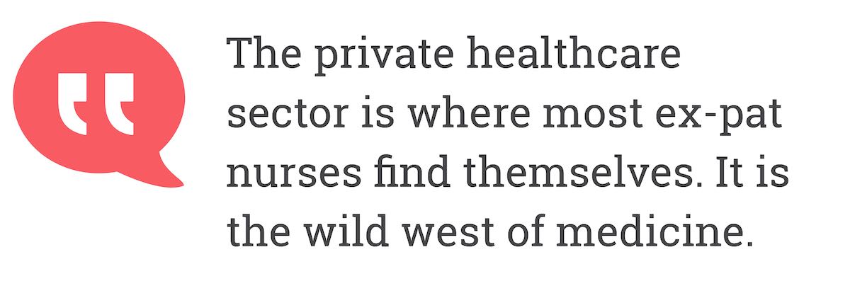 The private healthcare sector is where most (if not all) ex-pat nurses find themselves and this is the wild west of medicine, mostly unregulated and difficult to navigate.