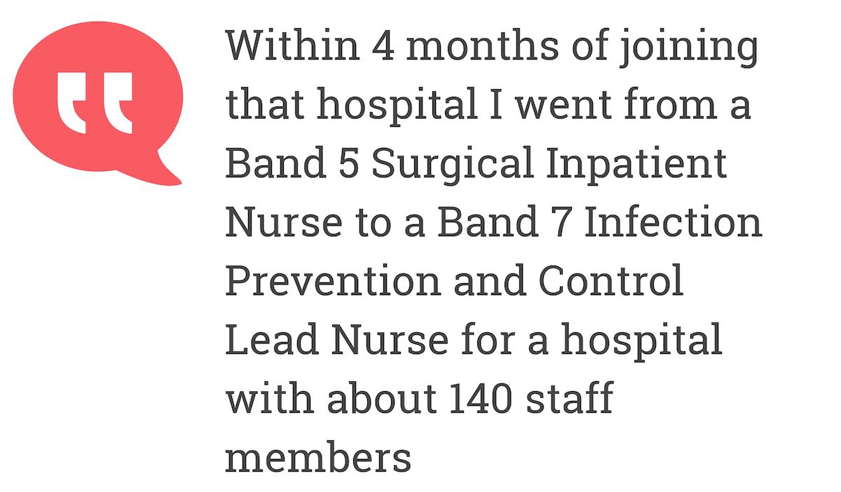"Within 4 months of joining that hospital, I went from a Band 5 Surgical Inpatient nurse to a Band 7 Infection Prevention and Control Lead Nurse"