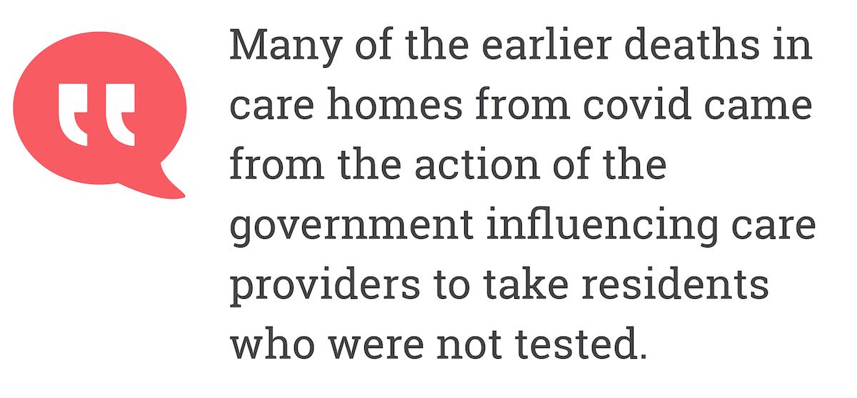 Many of the earlier deaths in care homes from covid came from the action of the government influencing care providers to take residents who were not tested. In retrospect, a poor decision.