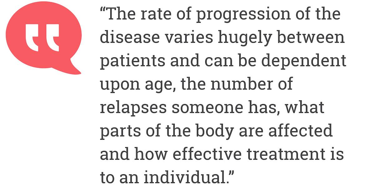 The rate of progression of the disease varies hugely between patients and can be dependent upon age, the number of relapses someone has, what parts of the body are affected and how effective treatment is to an individual.