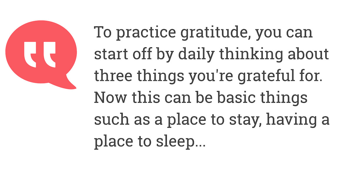 To practice gratitude, you can start off by daily thinking about three things you're grateful for.