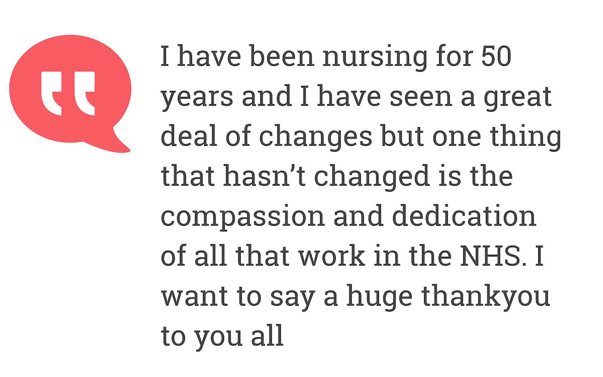 jb_xx.jp I have been nursing for 50 years and I have seen a great deal of changes but one thing that hasn’t changed is the compassion and dedication of all that work in the NHS . I want to say a huge thankyou to you all