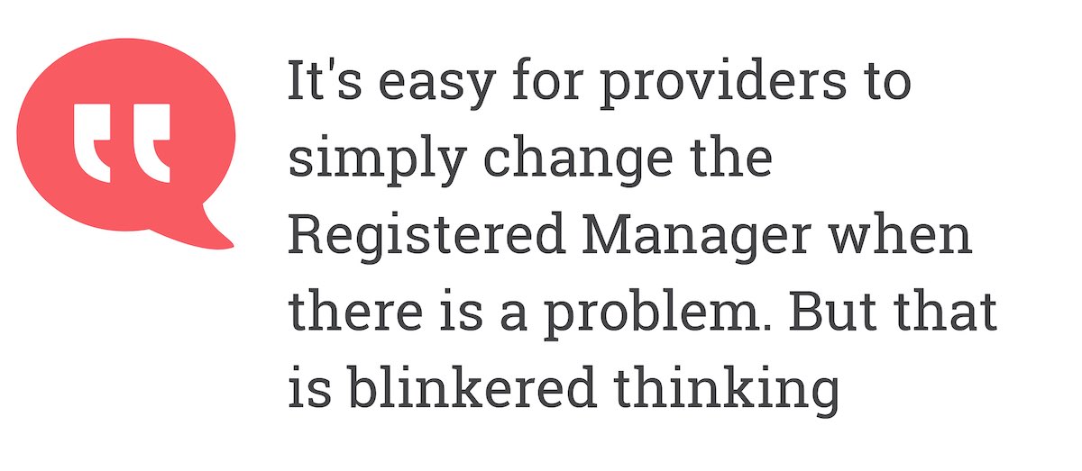 "It's easy for providers to simply change the Registered Manager when there is a problem. But that is blinkered thinking"Registered Managers should not just be left to get on with it and then blamed when things don’t work. They should be allowed influence and not held to account for things they cannot control.
