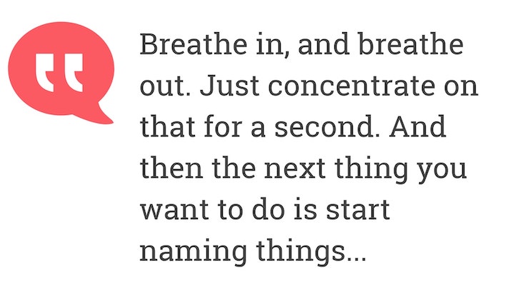 So, first, you want to concentrate on your breathing. Slow it down. Breathe in, and breathe out. Just concentrate on that for a second. And then the next thing you want to do is start naming things.