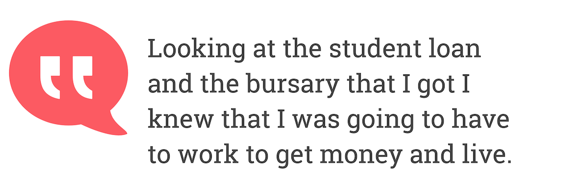 But to be honest, before I started I knew it was gonna be a struggle, and looking at the student loan and the bursary that I got I knew that I was going to have to work to get money and live.