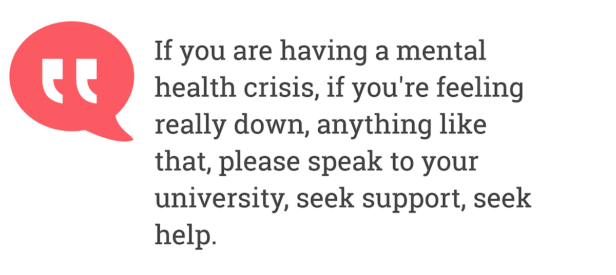 If you are having a mental health crisis, if you're feeling really down, anything like that, please speak to your university, seek support, seek help.