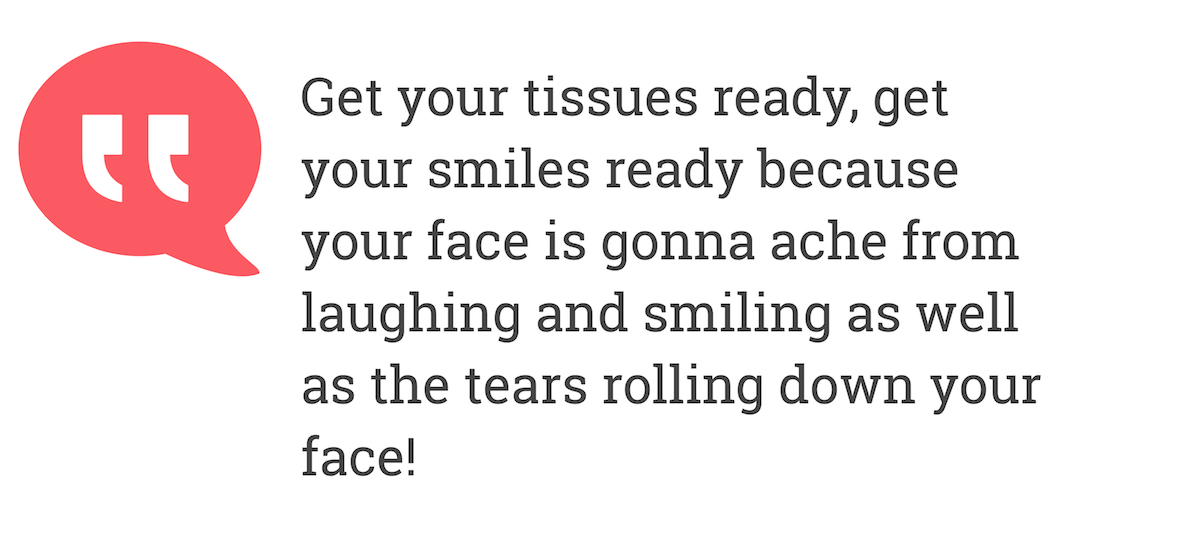 Get ready, get your tissues ready, get your smiles ready because your face is gonna ache from laughing and smiling as well as the tears rolling down your face. Your body's gonna ache physically, you're going to be mentally drained, but nine times out of ten this is amazing.