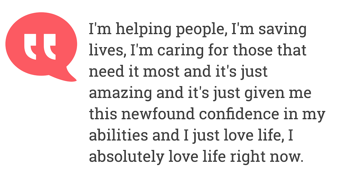 I'm helping people, I'm saving lives, I'm caring for those that need it most and it's just amazing and it's just given me this newfound confidence in my abilities and I just love life, I absolutely love life right now.