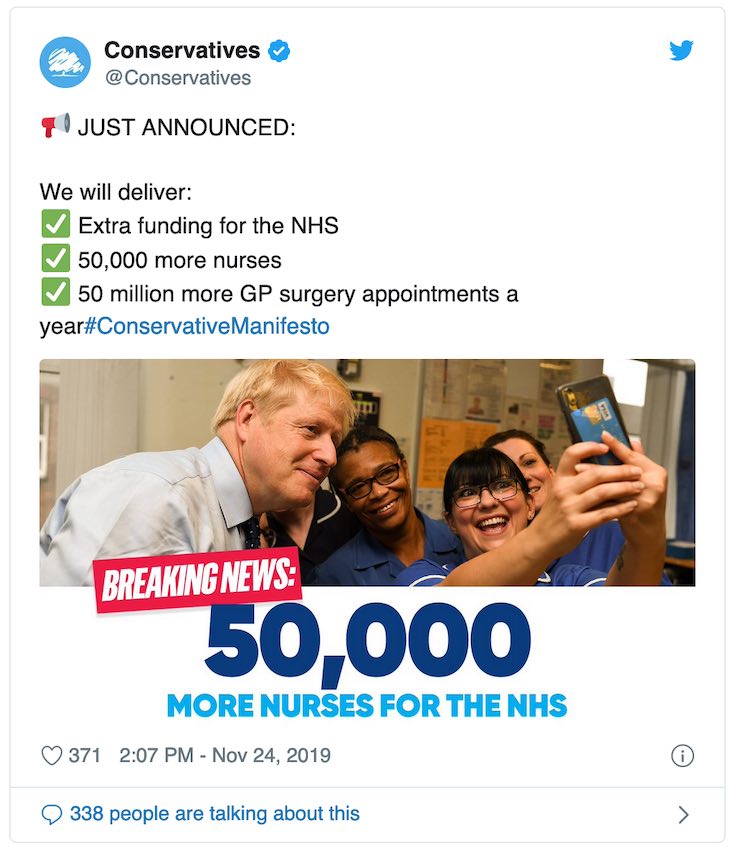 Tories pledge 50,000 more nurses, to bring back student bursaries and £1bn extra on social care25 Nov 2019 ● Nurses news, Nurses.co.uk editorial team