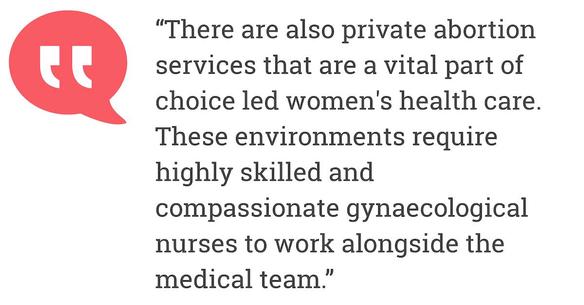 Gynaecology Nurses in private clinics can specialise in sexual health and abortion care and are able to manage a women's health from the point of puberty through to the management of menopause.